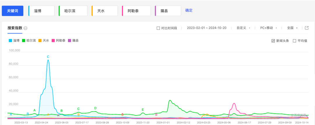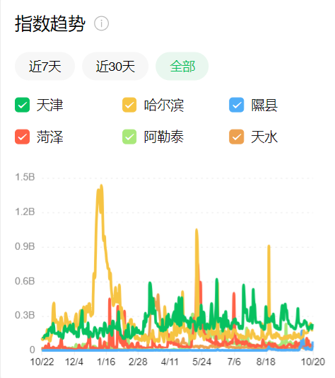 2023年4月,“淄博”一词的搜索指数达88000;六七月份,“榕江”一词在500以下,长期稳定;今年1月,“哈尔滨”一词的搜索指数接近28000;3月,“天水”一词的搜索指数接近7500;5月,“菏泽”一词的搜索指数为4300,“阿勒泰”一词的搜索指数为23470;8月,“天津”一词的搜索指数不到7000;10月,“隰县”一词的搜索指数接近5400。